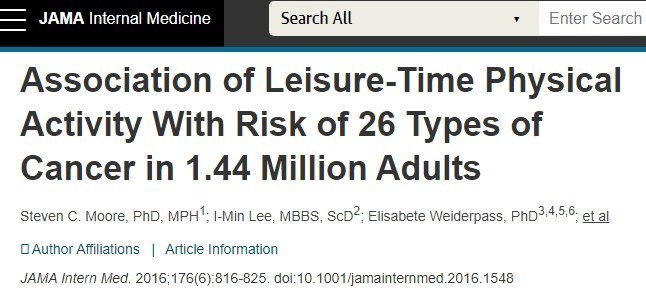 权威期刊JAMA曾发布过一篇关于运动与癌症风险的研究,通过对144万年龄跨度在19-98岁的人进行18年长期随访后发现,经常进行中强度运动锻炼可以降低癌症发病风险。